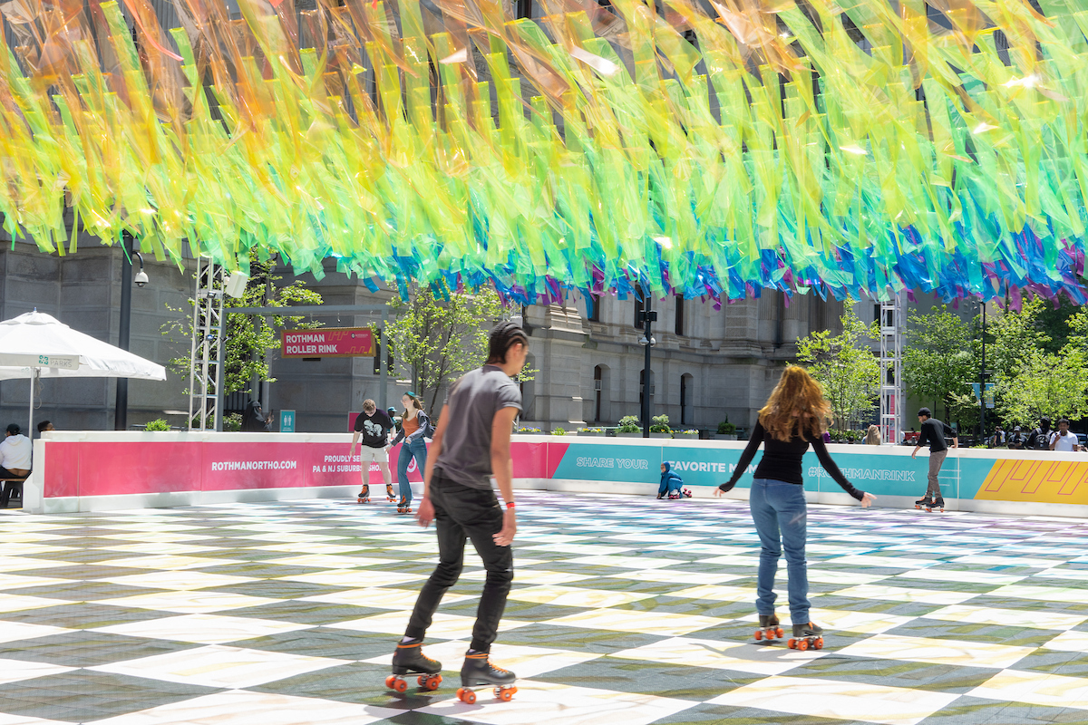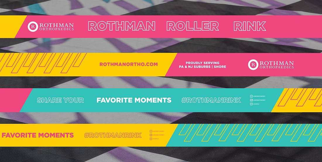 In the summer of 2023, I designed the dashers for the Rothman Orthopaedics Roller Rink, blending bold colors and dynamic patterns to create an engaging visual experience. The design was inspired by the overhead art installation by The Lucky Dog Studio, reflecting its vibrant energy and playful aesthetic.