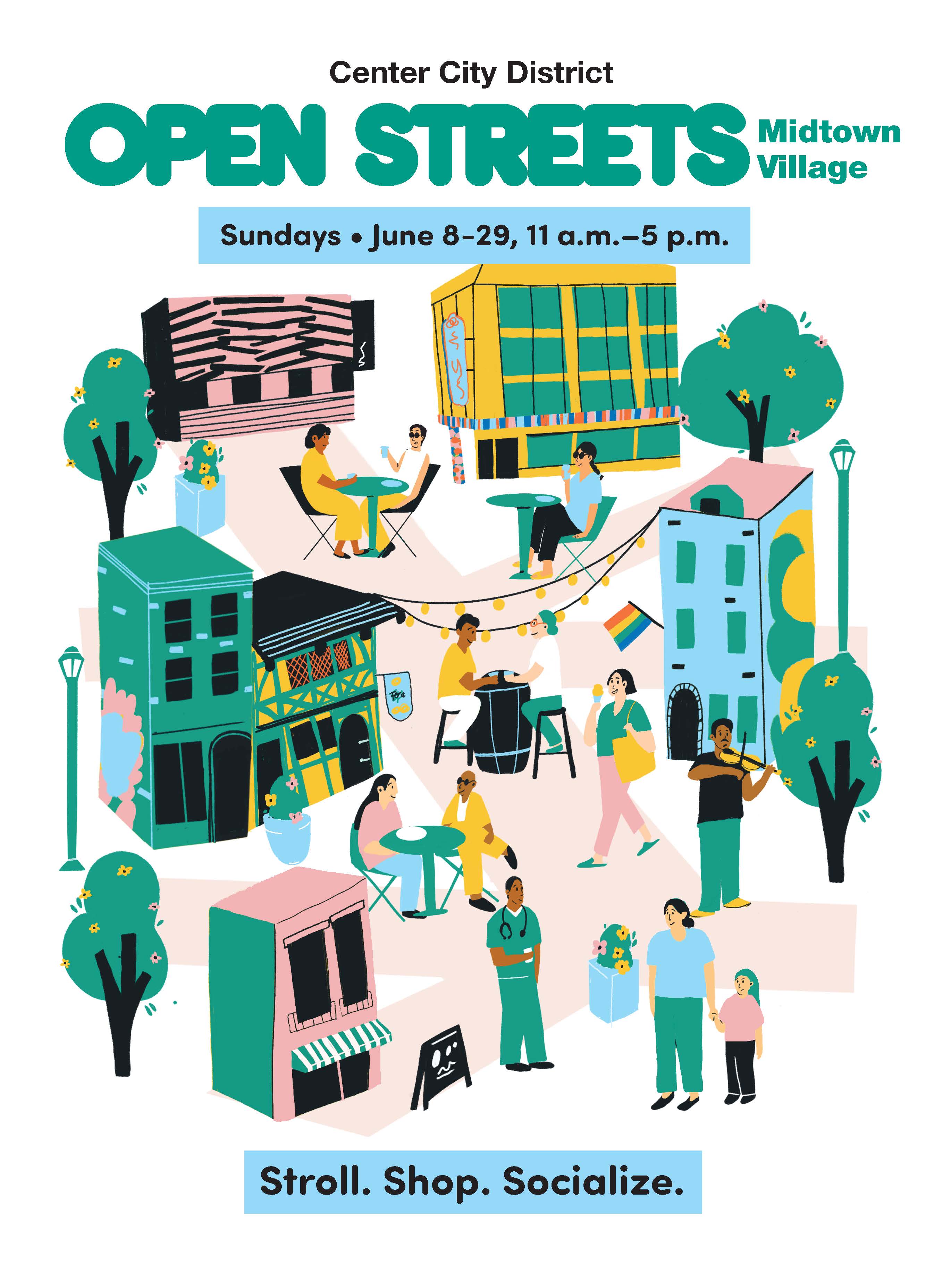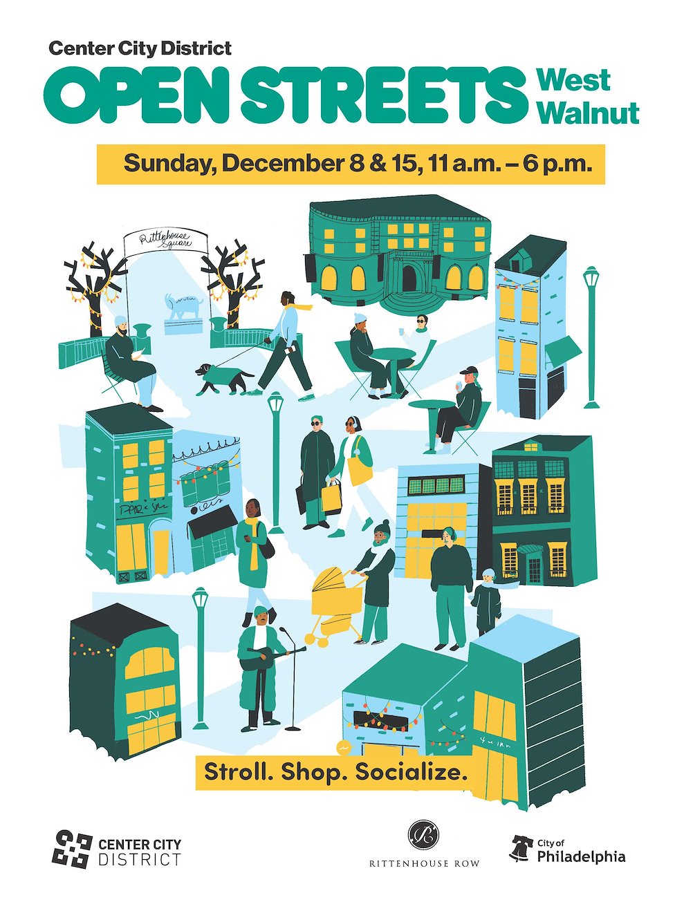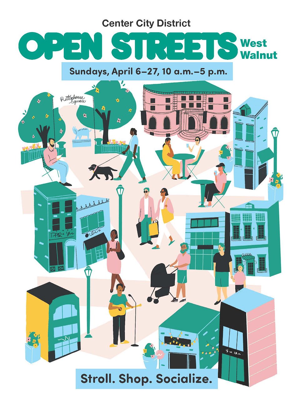 Center City District, with support from Rittenhouse Row, Midtown Village Merchant’s Association and the City of Philadelphia, temporarily close streets to vehicles, creating space for people to walk, bike, and enjoy public activities. During these closures, pedestrians are invited to stroll nearly six blocks of car-free space while enjoying expanded outdoor dining, shopping and ambient entertainment for all ages.
